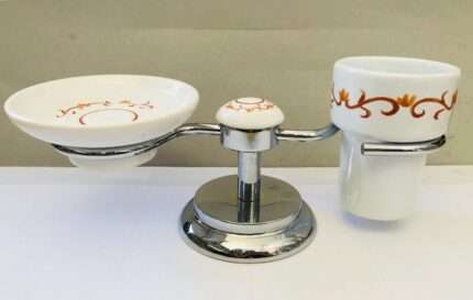 COPPIA APPOGGIO CLASSICO COUNTRY CERAMICA/CROMO DIPINTO A MANO Bicchiere Porta Spazzolini e Piattino Porta sapone